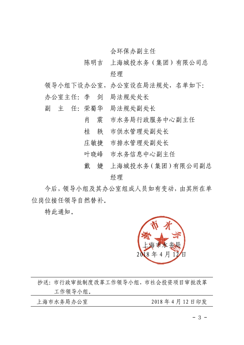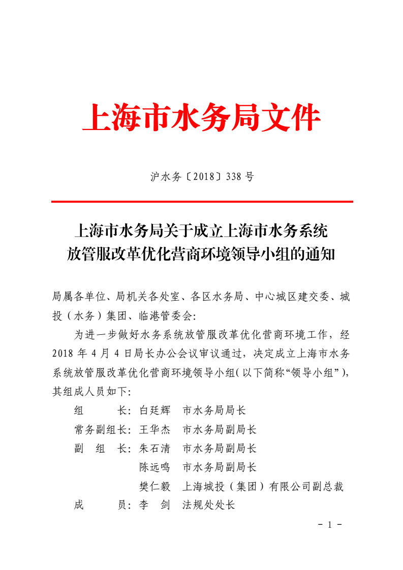 上海市水务局关于成立上海市水务系统放管服改革优化营商环境领导小组的通知(沪水务〔2018〕338 号 ) 2018-05-21